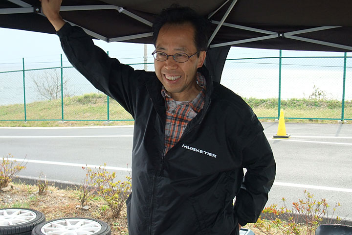 ・当日の小椋。実は強風のため飛ばされそうなテントを支えるの図。