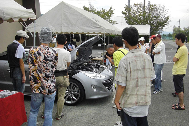 到着後準備を進めるも、瞬く間にRCZへ多くのギャラリーが集合。ブリスターフェンダーやダブルバブルルーフ以外にもエンジンルームが気になる方も多く見受けられ、走りへの期待も高いものと思われます。
